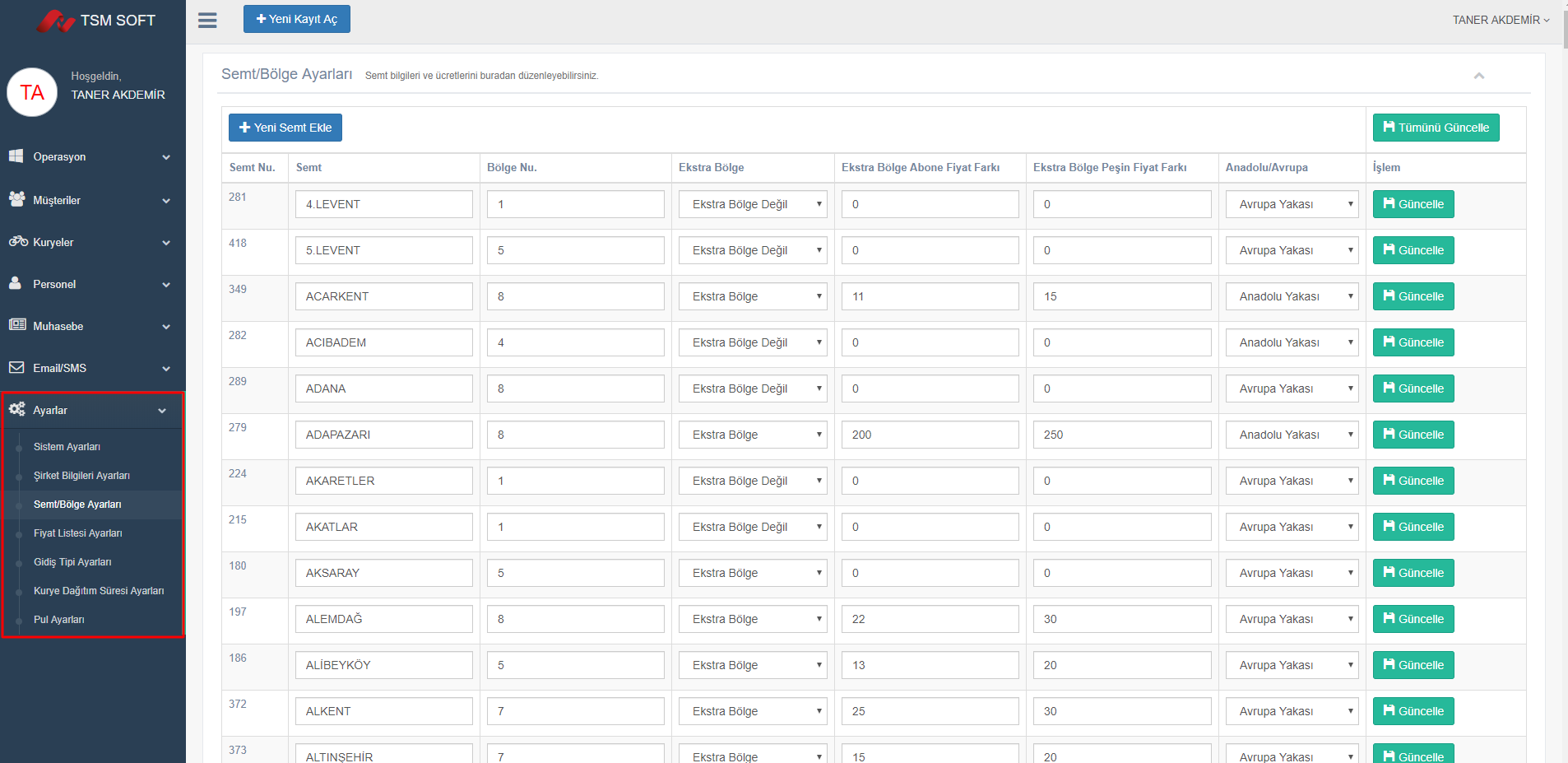* Dilediğiniz semt için dilediğiniz birim fiyatı belirleyebilir ve bölgelerini güncelleyebilirsiniz.