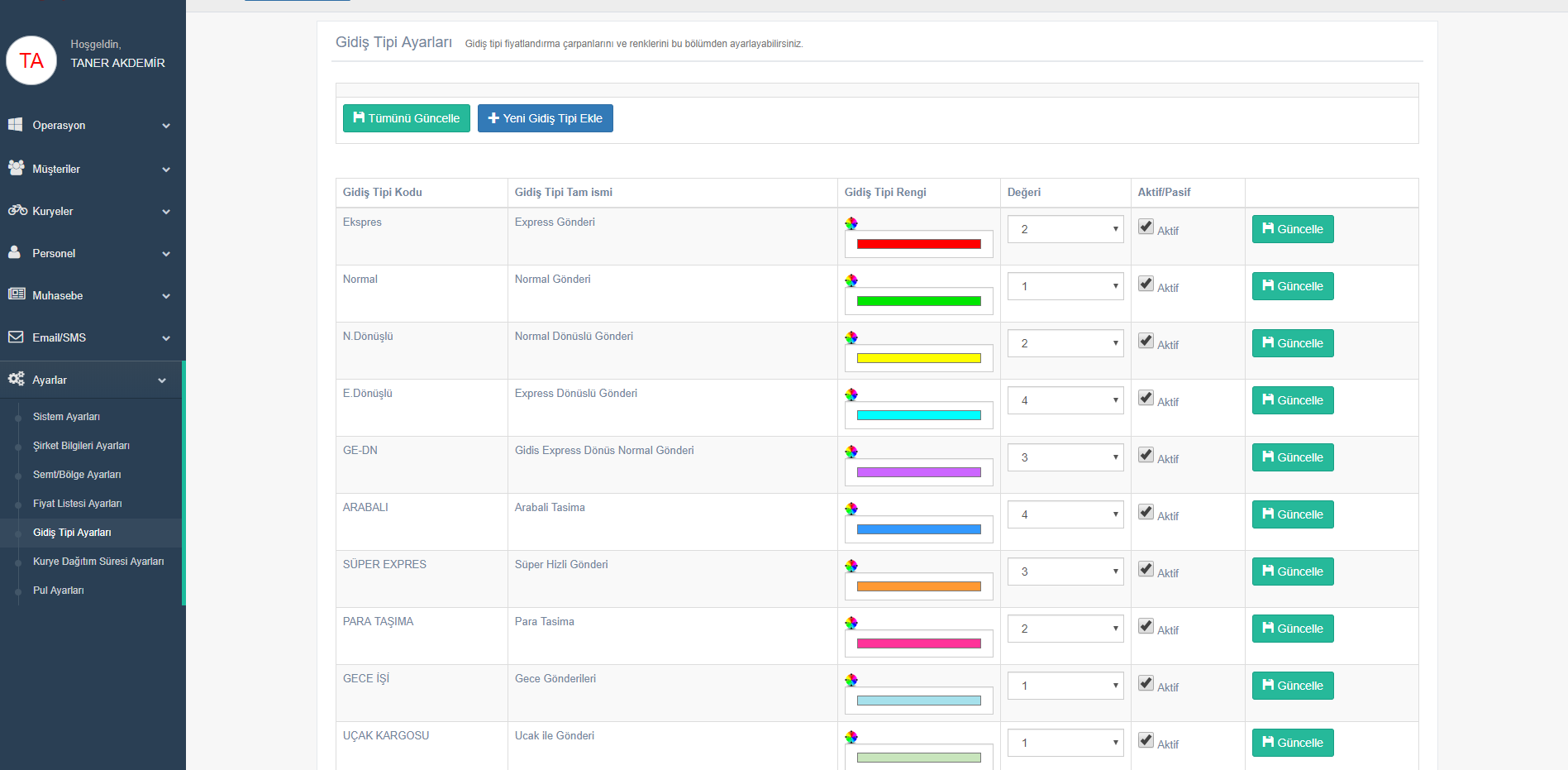 * Dilediğiniz gönderi tipini aktif edebilir, rengini ve çarpım katsayını kendi isteğinize göre belirleyebilir veya yeni bir gönderi tipi belirleyerek sisteme tanımlayabilirsiniz.