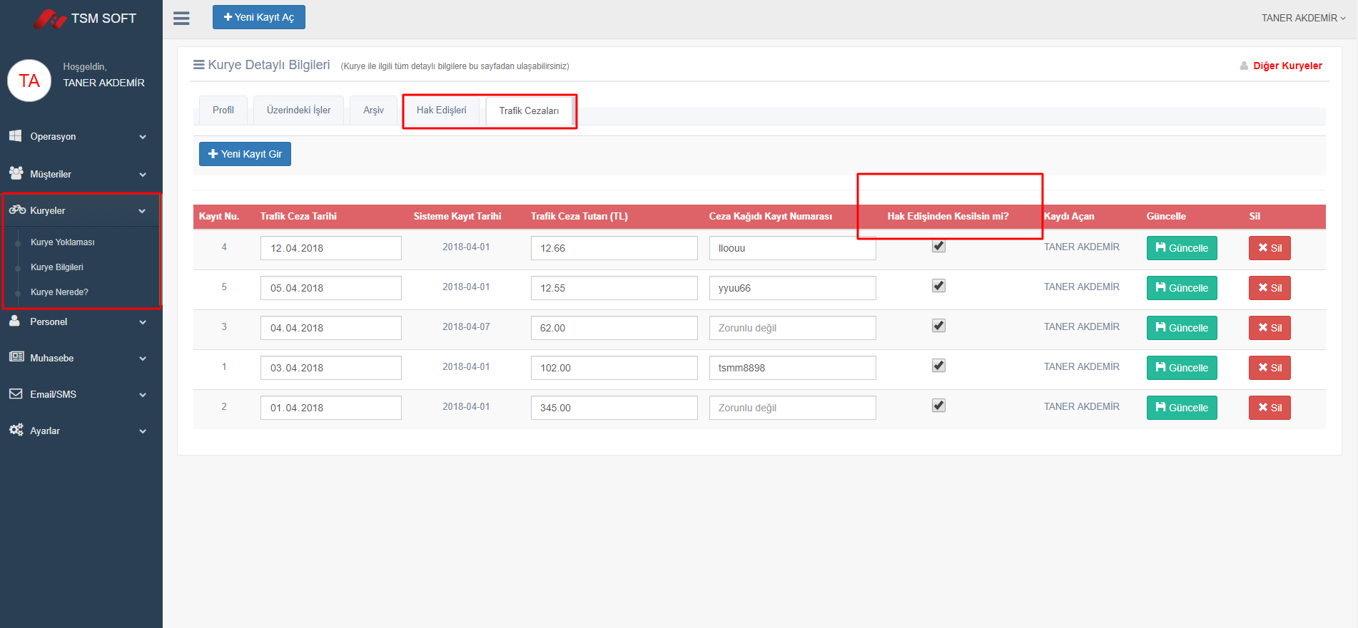 4. Trafik cezası kayıtları ve Kurye hakedişleri hesaplama